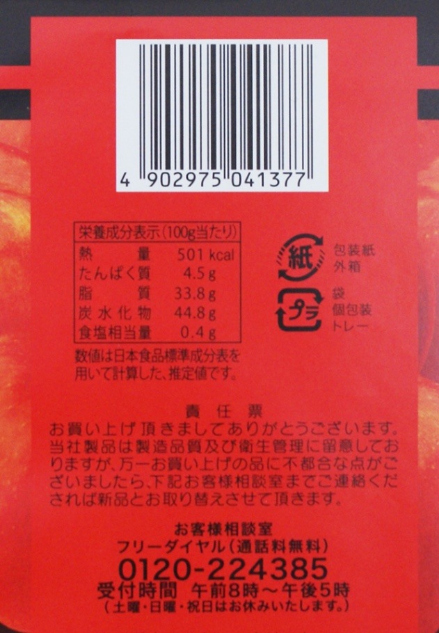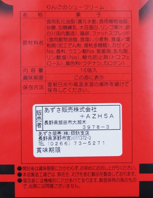 食用乳化油脂(植物油脂、還元水飴、加糖練乳、砂糖、リンゴ果汁、卵白、その他)、鶏卵、ファットスプレッド(食用動物油脂、食塩)、小麦粉、食塩、増粘剤(加工澱粉、増粘多糖類)、香料、カゼインNa(乳由来)、乳化剤、クエン酸Na、膨張剤、着色料(カロチン)、リン酸塩(Na)酸化防止剤(トコフェロール)、(原材料の一部に大豆を含む) 製造工場では落花生、えびを含む製品も製造しています。 |
