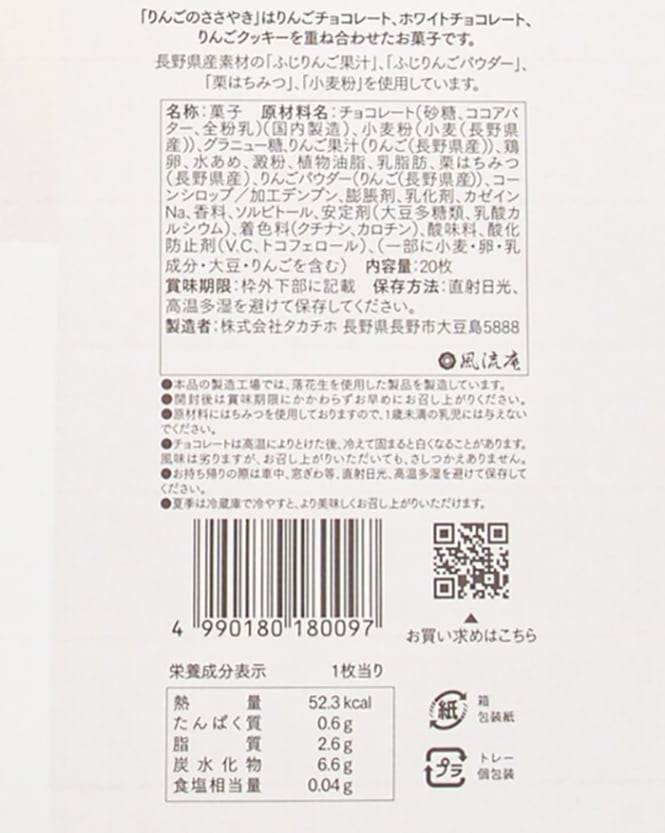 長野県産のふじりんご果汁、ふじりんごパウダー、栗蜂蜜、小麦粉を使用。 りんごチョコレート、ホワイトチョコレート、りんごクッキーを重ね合わせ、サクサクとした生地に風味良いチョコレートが調和したお菓子です。