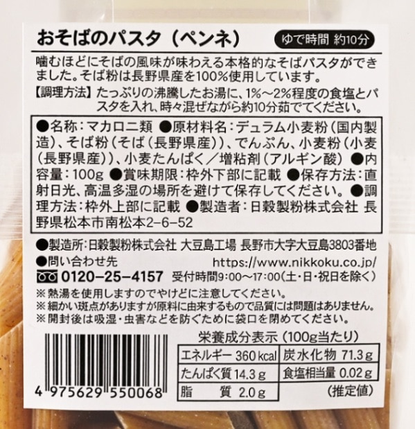 原材料/デュラム小麦粉(国内製造)、そば粉(そば(長野県産))、でんぷん、小麦粉(小麦(長野県産))、小麦たんぱく/増粘剤(アルギン酸)