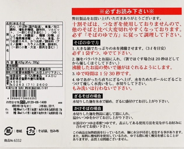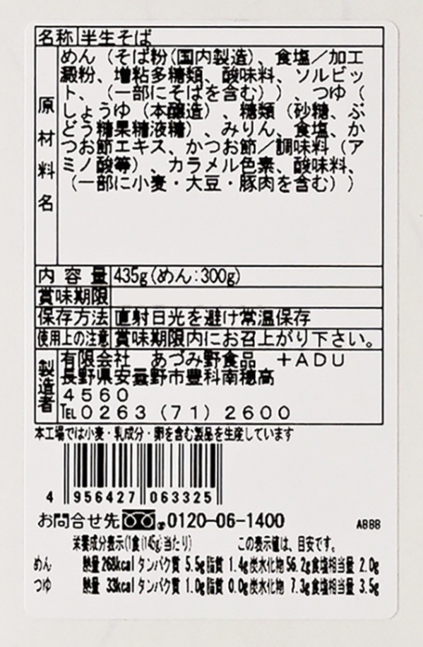 製造工場では蕎麦、小麦、卵、乳を含む製品も生産しています。