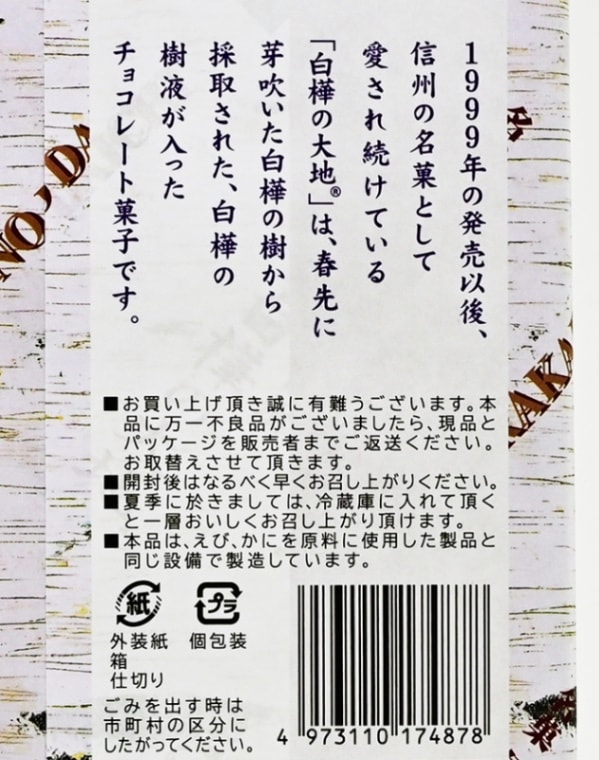 「白樺の大地」はミルクチョコレートにゴーフレットクラムをちりばめ、ホワイトチョコレートでコーティングしたチョコレート菓子。信州白樺の木をイメージして作ったお菓子です。