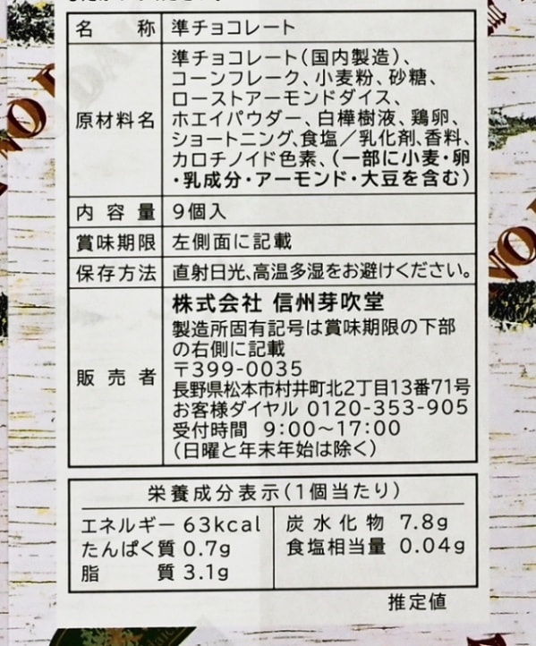 原材料/準チョコレート(国内製造)、コーンフレーク、小麦粉、砂糖、ローストアーモンドダイス、ホエイパウダー、白樺樹液、鶏卵、ショートニング、食塩/乳化剤、香料、カロチノイド色素、(一部に小麦、卵、乳成分、アーモンド、大豆を含む)