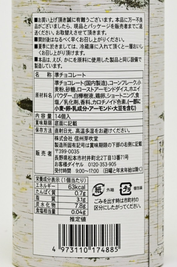 - 信州芽吹堂 白樺の大地 14個入 紙缶 チョコレートクッキー 信州長野のお土産