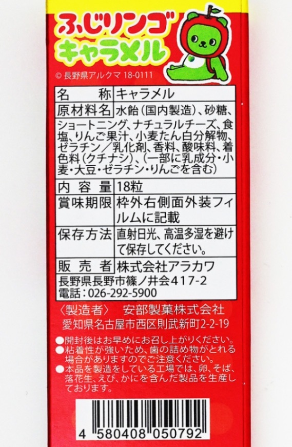 ふじ林檎果汁使用 信州限定アルクマふじりんごキャラメル18粒入入